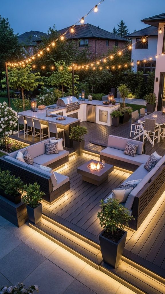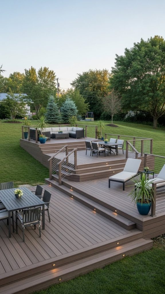 Each level serves a distinct purpose such as dining lounging or a fire pit area. Staircases connect the levels and must include proper riser height and handrails for safety. Composite decking is often chosen for high traffic levels because it resists wear and fading better than natural wood.