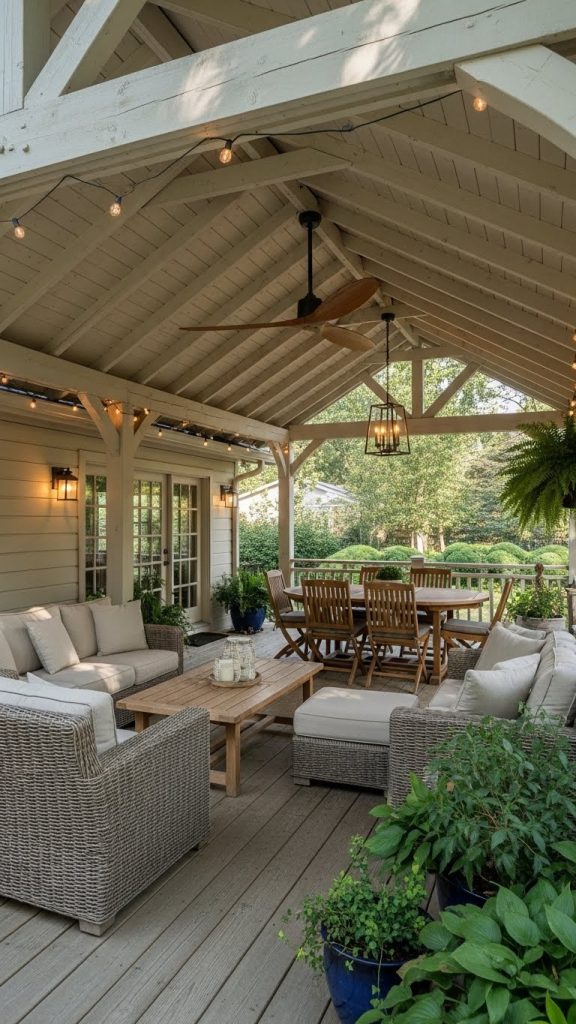 A covered deck is ideal for outdoor dining relaxation and even work from home setups. Furniture lasts longer due to protection from the elements. Maintenance involves inspecting roof panels cleaning debris and checking for leaks. This deck style is especially beneficial in regions with strong sunlight or frequent rain providing a comfortable outdoor area throughout the year.