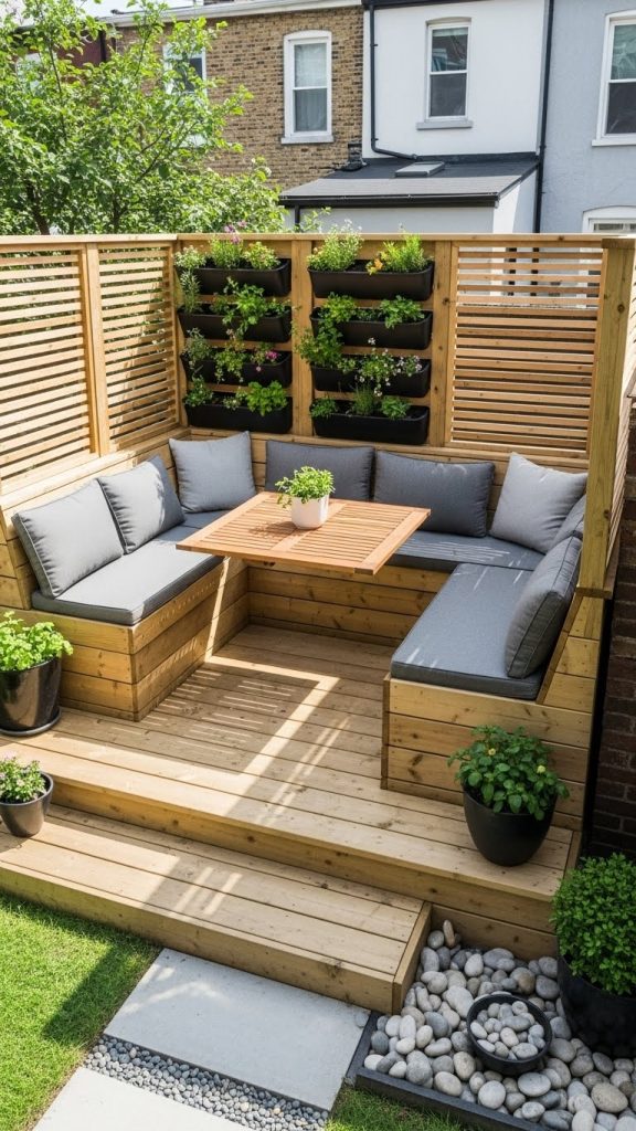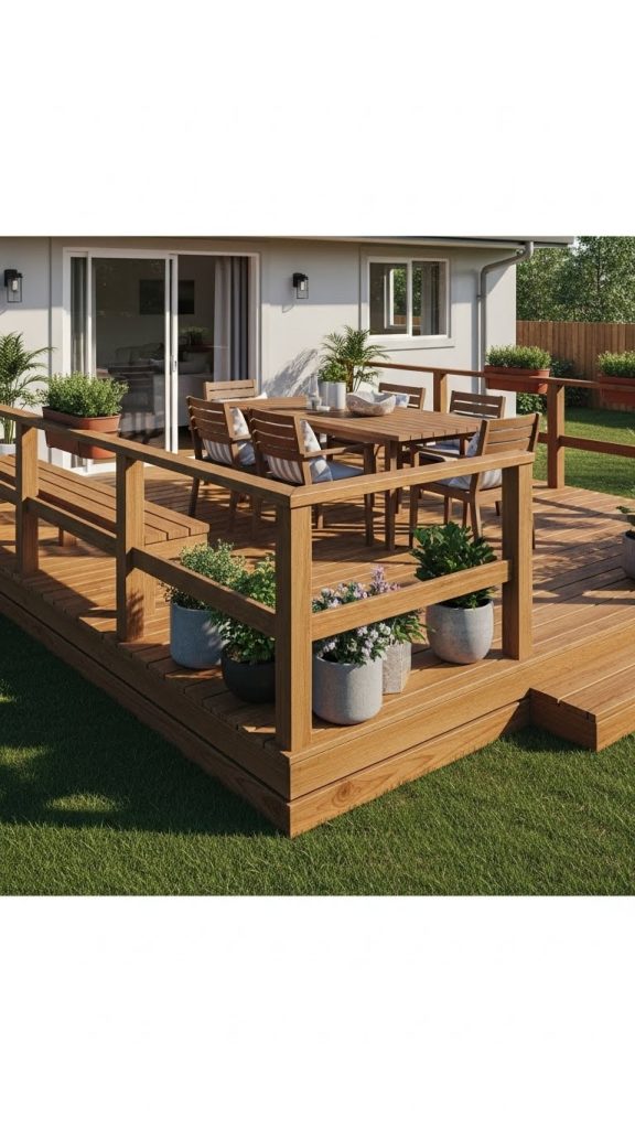 The deck may be ground level or slightly raised depending on space constraints. Vertical elements like privacy screens or planters add functionality without taking up floor space. Proper anchoring ensures stability even in limited areas.