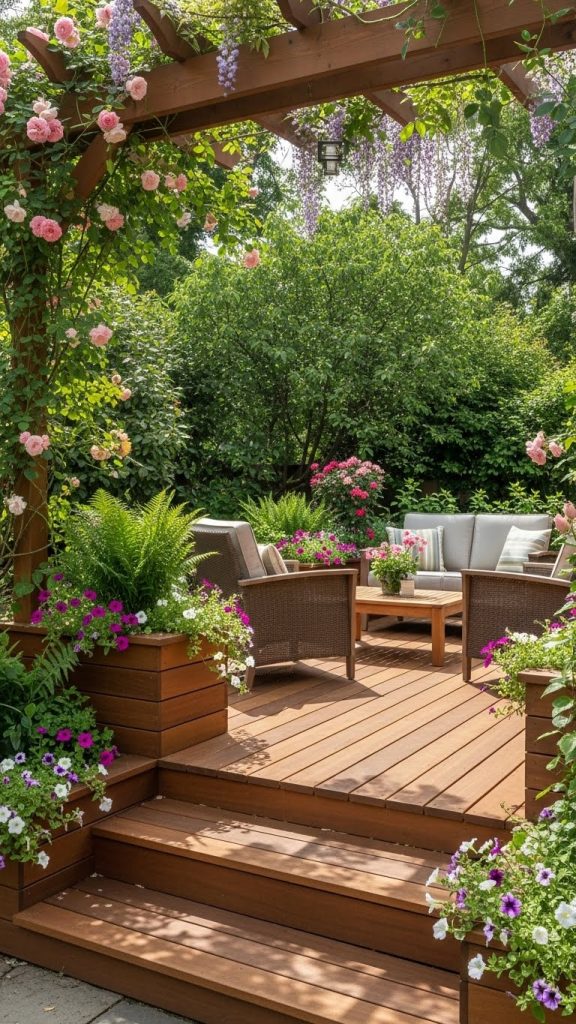 This deck is used for relaxation gardening and outdoor meals surrounded by plants. Maintenance involves caring for both the deck and garden elements. Regular watering pruning and deck sealing keep the space healthy and attractive. A garden integrated deck creates a calming retreat that enhances both outdoor living and landscape design.