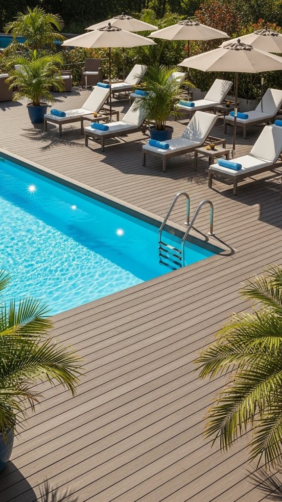 The deck structure must be slightly elevated to allow water runoff and prevent puddling. Stainless steel fasteners are essential to avoid corrosion. Railings may be optional depending on pool layout but steps and edges must be clearly defined.