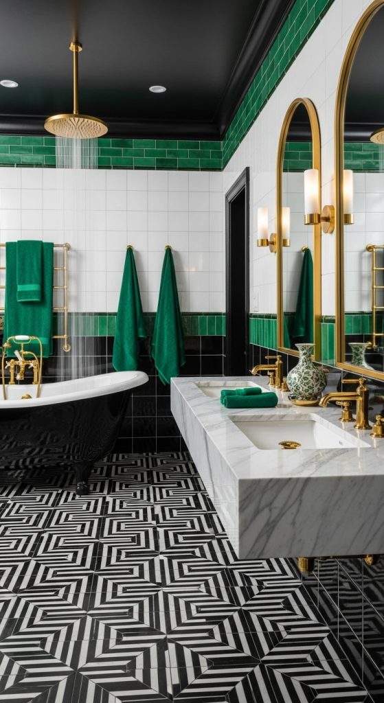 Use glossy black and white tiles, gold fixtures, and mirrors with intricate detailing. Add touches of emerald, sapphire, or burgundy to infuse richness.