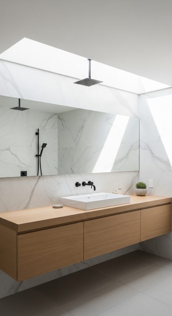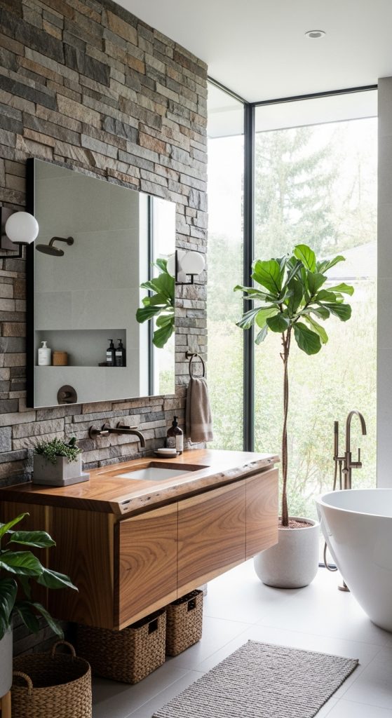 Use a combination of stone, wood, and metal to create visual contrast. Light gray or taupe tiles with floating wooden vanities achieve a balanced and serene look.