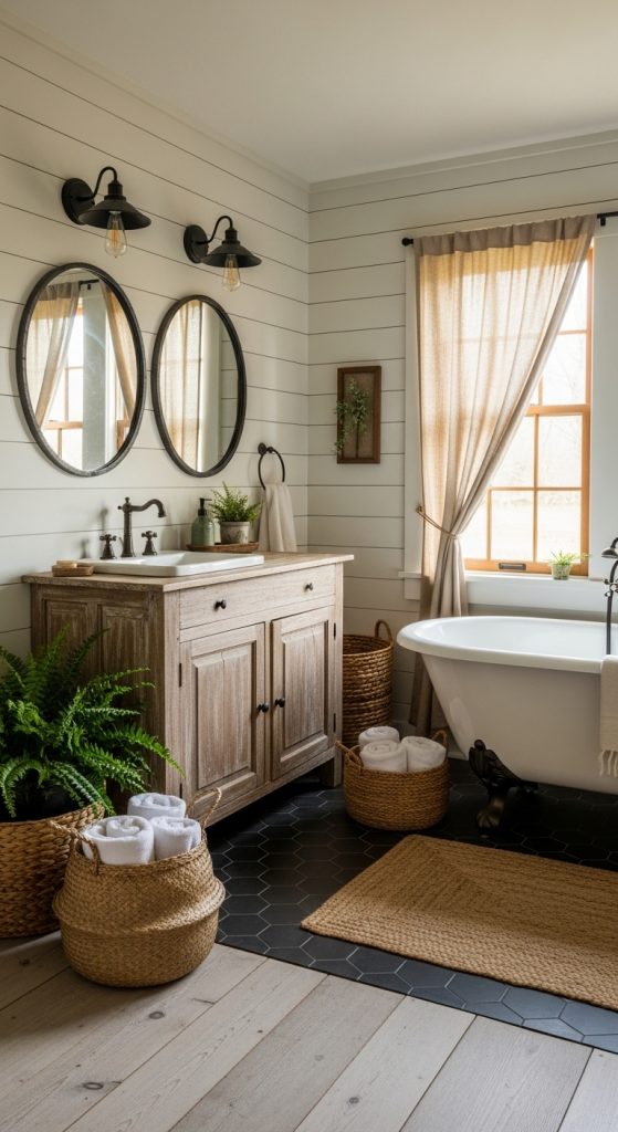 Opt for a weathered vanity, a clawfoot tub, and black metal accents. Open shelves with woven baskets and mason jar organizers add both charm and functionality.