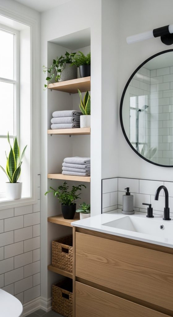 Use a light paletteโwhite, soft gray, and pale wood tonesโwith accents of black metal or matte fixtures. Incorporate natural elements like wood shelving, stone sinks, and woven baskets for warmth.