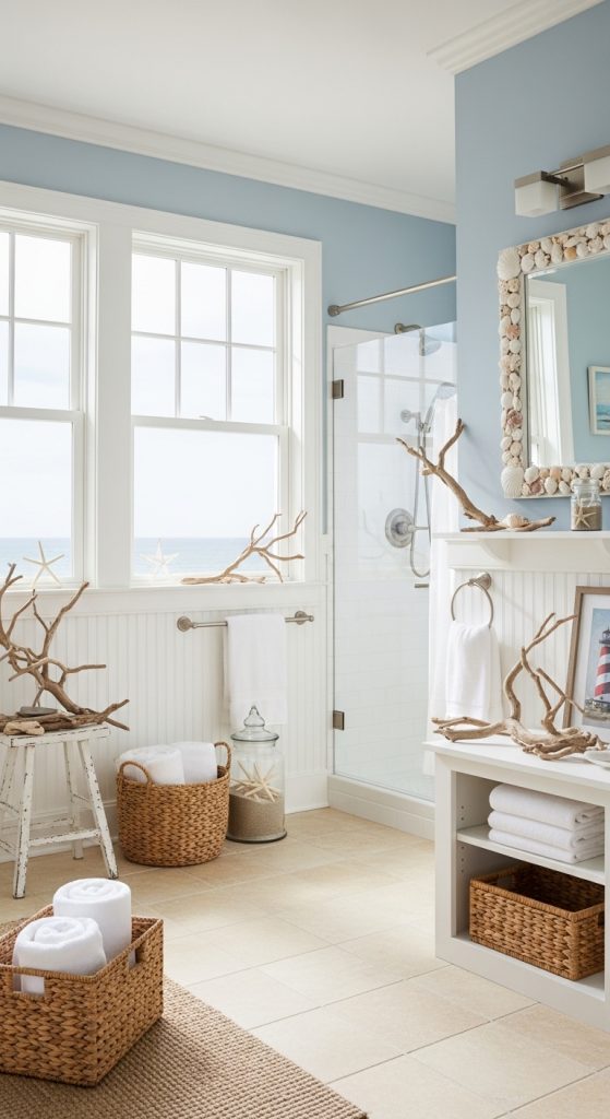 Use beadboard paneling, wicker baskets, and driftwood accents to enhance the coastal charm. Choose brushed nickel or matte white fixtures for a subtle touch of elegance.
