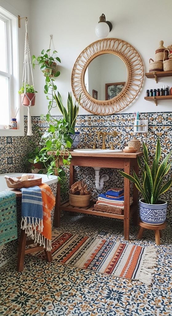 A bohemian bathroom is full of creativity, color, and free-spirited design. This style embraces a mix of textures, patterns, and cultural influences.