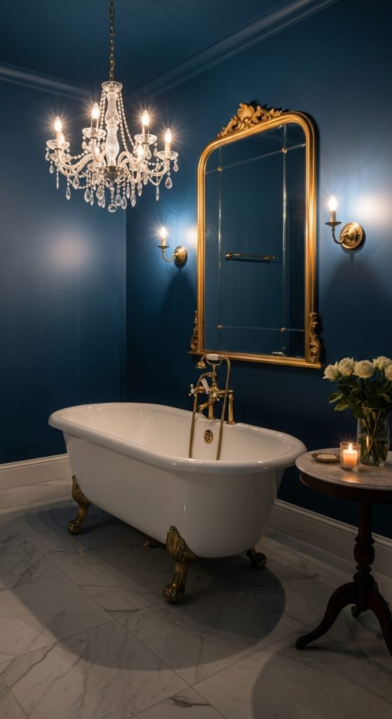 Think clawfoot bathtubs, ornate mirrors, brass fixtures, and marble surfaces. Use rich tones like deep navy, emerald, or blush for walls and textiles. Crystal chandeliers or globe sconces add sophistication.
