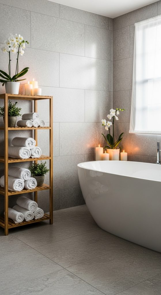 Use soft neutral colors like ivory, sage, and stone gray. Choose natural materials such as bamboo, marble, or pebbled tiles. Incorporate ambient lighting and scented candles for atmosphere.