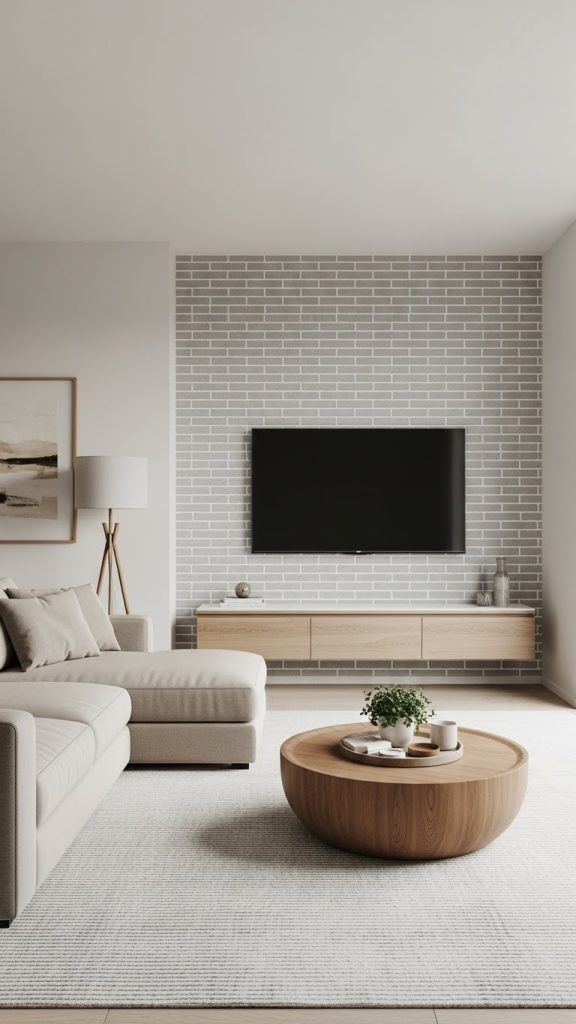 Thin brick veneer offers the look of full brick without excessive bulk. It is lighter, easier to install, and suitable for nearly any wall type. Thin veneer achieves a clean and minimalist appearance, especially when arranged in uniform patterns. This design works well in small living rooms, modern apartments, and spaces where visual balance is essential. Preparation involves measuring the wall, applying adhesive, and placing thin veneer tiles with consistent spacing. Grout adds depth and durability. This minimalist brick wall keeps the TV area elegant and simple while still offering texture. The result is a streamlined feature wall that complements minimalist decor without overwhelming the space.