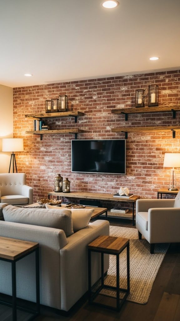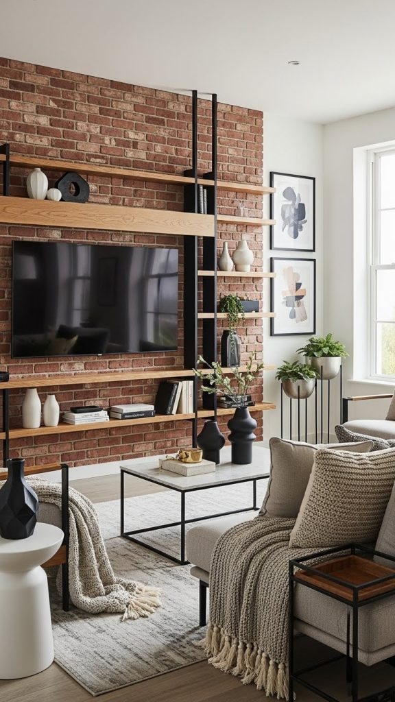 Combining brick with other materials produces a layered, dynamic look. Popular combinations include brick with wood, metal, concrete, or natural stone. Brick and wood create warmth, while brick and metal establish an industrial feel. Brick and concrete deliver a modern and structured appearance. This approach allows homeowners to tailor the design according to personal style. For example, wooden floating shelves on a brick backdrop add function and beauty. Preparation depends on the material mix. Brick installation must be done first, followed by anchoring shelves or panels. Ensure proper studs and supports are in place for mounting the TV and any additional elements. This idea is perfect for those who want a customized and visually rich feature wall.