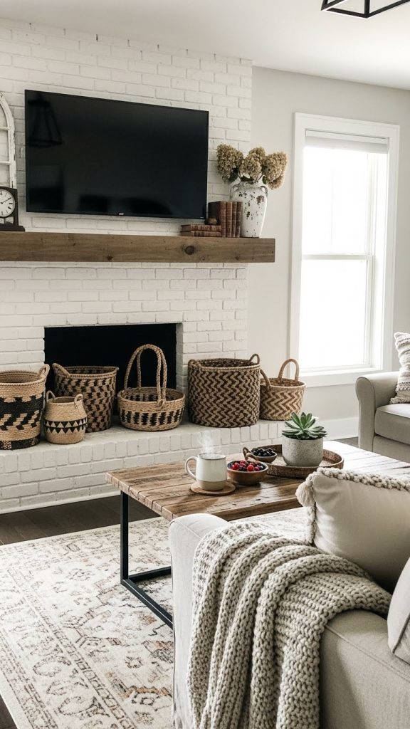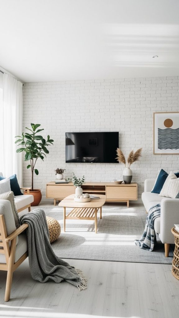 Farmhouse design blends simplicity with rustic comfort. A white brick TV wall captures this look perfectly by combining texture with clean, fresh tones. The brick softens the TV area while maintaining a cozy aesthetic. This style pairs beautifully with wooden mantels, woven baskets, linen fabrics, and vintage accents. Preparation includes using real brick, veneer, or faux brick panels painted in white. Distressing techniques can enhance the country feel. For homeowners who prefer a more polished farmhouse look, smooth white brick or painted veneer works best. The installation surface must be prepped by cleaning and leveling to ensure proper adhesion. This idea suits living rooms, open concept homes, and family spaces where warmth and simplicity are priorities.