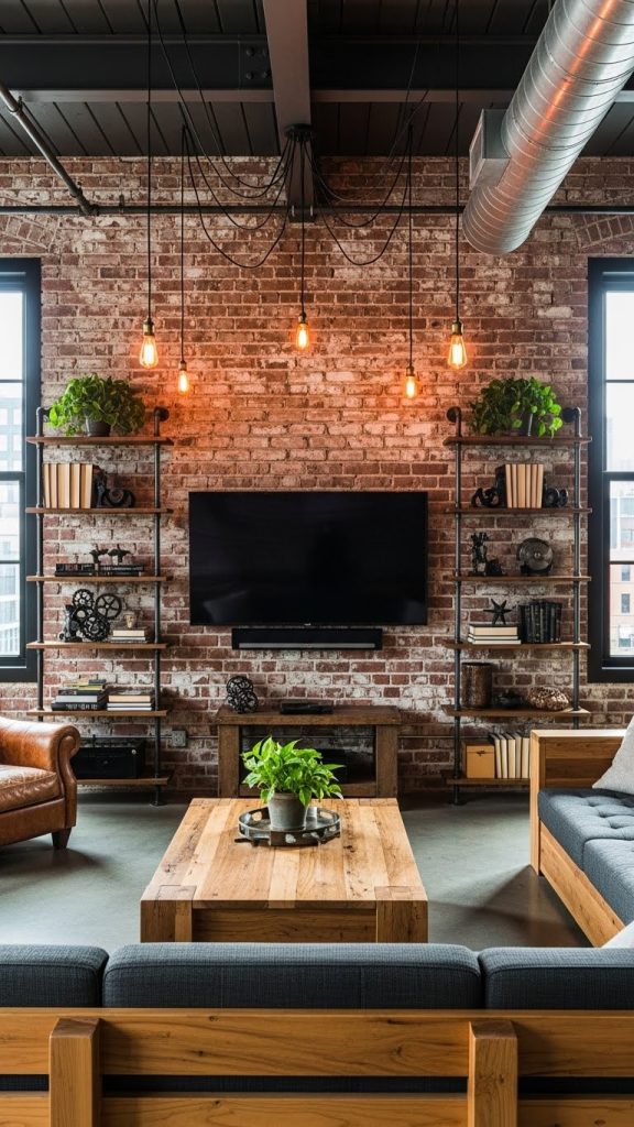Industrial design embraces raw materials, unpolished textures, and a gritty character that celebrates authenticity. An exposed brick TV wall aligns perfectly with this style. In many older buildings, removing plaster reveals original brick that can become the focal point of the room. Even in newer homes, intentionally adding rugged brick or brick veneer gives the appearance of an industrial loft. This style pairs well with black metal frames, pipe shelving, Edison bulbs, and reclaimed wood furniture. Preparation for an exposed brick wall includes cleaning, repairing damaged areas, and applying a stabilizing sealant if the brick is old or dusty. Keeping the brick unpainted preserves the industrial effect. Cables can be concealed behind conduit pipes to align with the theme. This idea is ideal for homeowners who enjoy raw, urban aesthetics.
