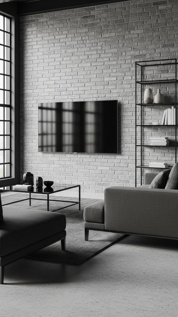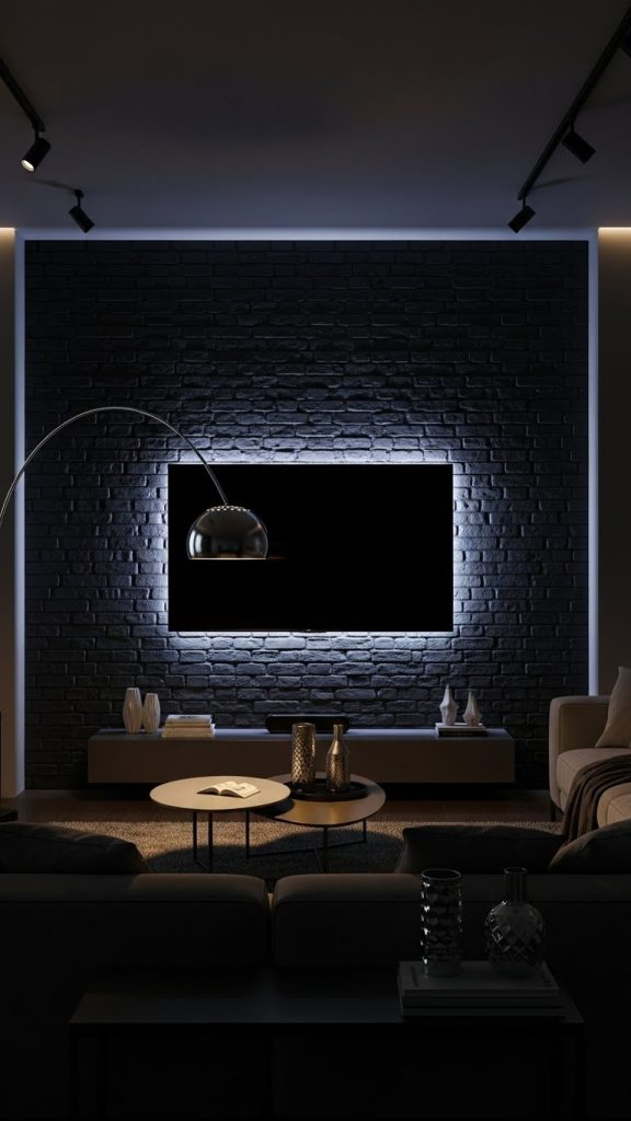 A black brick TV wall offers a dramatic and bold focal point with a luxurious edge. The dark backdrop enhances the cinematic feel of the entertainment area and allows the TV to blend effortlessly. Black brick suits modern, minimalist, and industrial interiors and pairs well with metallic accents, glass elements, and LED strips. Preparation involves starting with clean brick and applying primer followed by high quality heat resistant black paint. Satin or matte finishes are often preferred for a refined look. Homeowners using brick veneer can choose pre painted black options to simplify installation. This design requires thoughtful lighting because dark tones absorb light. LED backlighting or wall sconces help maintain balance. A black brick TV wall adds depth and sophistication that elevates the room.