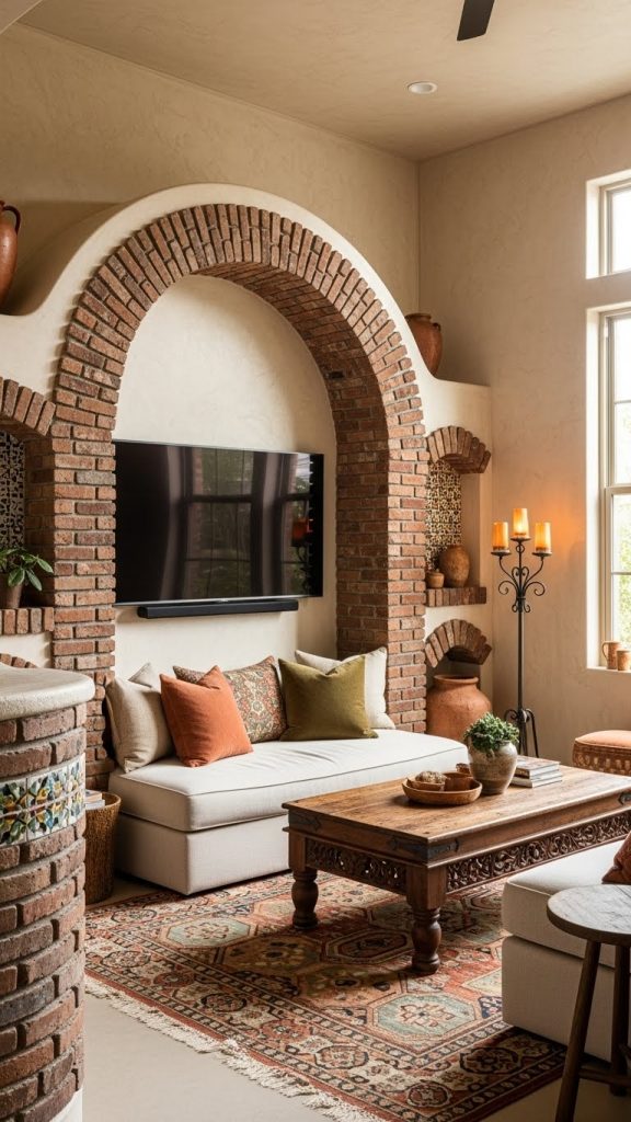 A brick arch adds architectural interest and becomes an impressive focal element in the home. Incorporating an arch around the TV gives the space a Mediterranean, vintage, or old world aesthetic. The curvature softens the hardness of brick and contrasts beautifully with the straight lines of modern screens. This concept requires precise planning and skilled craftsmanship, especially if building with real brick. Brick veneers or molded panels can simplify the process. Preparation begins with measuring and framing the arch shape, ensuring structural support, and cutting bricks or panels to fit the curve. Mortar or adhesive must be applied carefully to maintain consistent spacing. This idea suits homeowners who want a statement feature that blends tradition with modern technology.