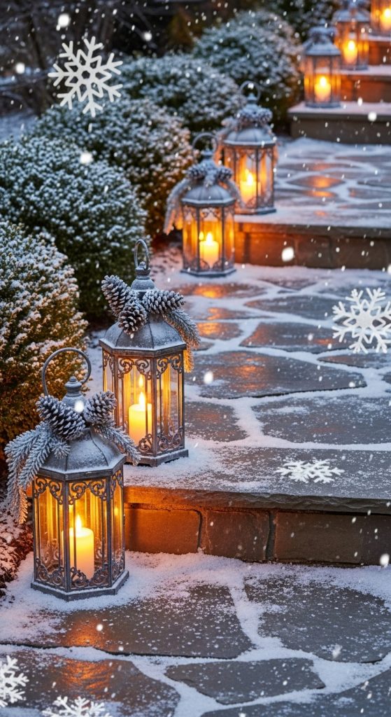 An outdoor candle lantern pathway creates a beautiful and inviting atmosphere for guests arriving at your home during the holiday season. For this decor idea, select sturdy lanterns made of metal or thick glass to withstand outdoor conditions. Choose battery operated candles for safety, especially in windy or unpredictable weather. Place the lanterns along pathways, steps, or porch edges, spacing them evenly for visual balance. You can also fill the bottom of each lantern with a small amount of artificial snow, pine cones, or holiday ornaments for added decoration. When preparing materials, ensure lanterns have secure bases to prevent tipping. Outdoor lighting enhances curb appeal and contributes to a festive welcome. If you prefer a more natural look, you can also place lanterns among evergreen shrubs or along garden borders. This decor approach works particularly well at night, casting soft and inviting light across your outdoor space. It is a perfect blend of practicality and beauty, offering safety for guests while contributing to your overall holiday atmosphere.
