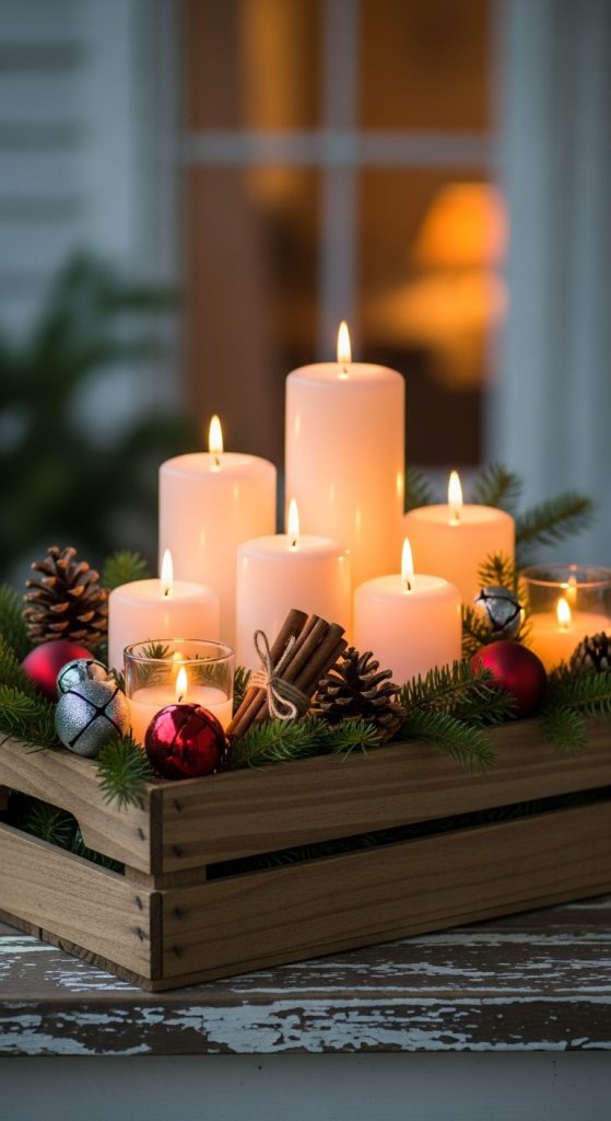 A wooden crate candle display offers a rustic and comforting Christmas accent that suits farmhouse, cottage, and vintage inspired interiors. Begin by selecting a sturdy wooden crate or box, preferably with a natural or lightly distressed finish. The crate becomes your container for building a layered vignette. Place a heat resistant board or tile inside the crate to protect the wood from candle heat. Choose a combination of pillar candles, votives, or battery operated candles for flexibility and safety. Arrange them in varying heights to create depth. Surround the candles with elements such as evergreen branches, pine cones, cinnamon sticks, and small ornaments. These fillers provide seasonal color and texture while framing the candles beautifully. When preparing materials, make sure the crate is wide enough to accommodate the candles without crowding. This decor piece works well as a centerpiece, coffee table accent, or porch decoration. If used outdoors, battery operated candles are safer and more practical. The arrangement adds a cozy, handcrafted feeling to your holiday space and showcases how simple materials can be transformed into charming decor with thoughtful styling.