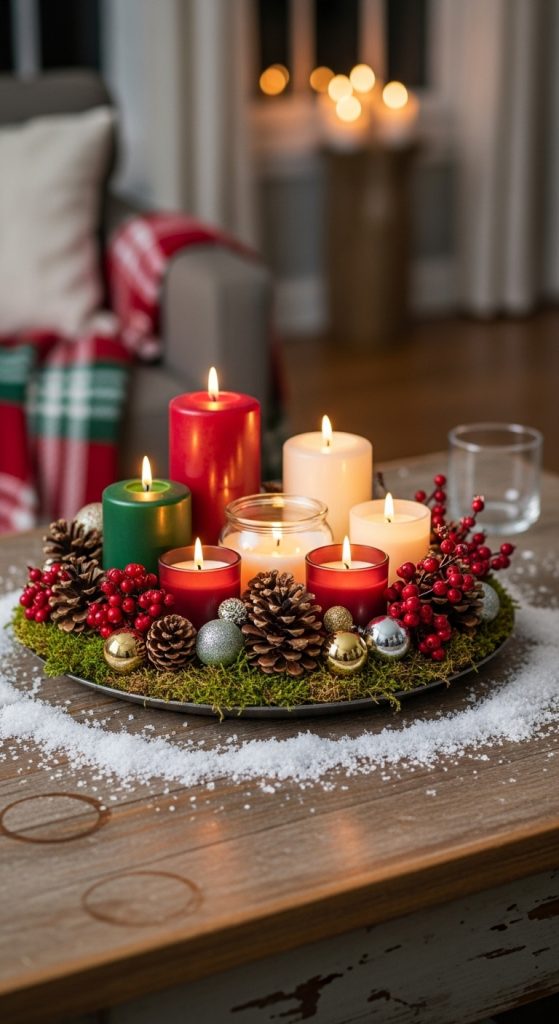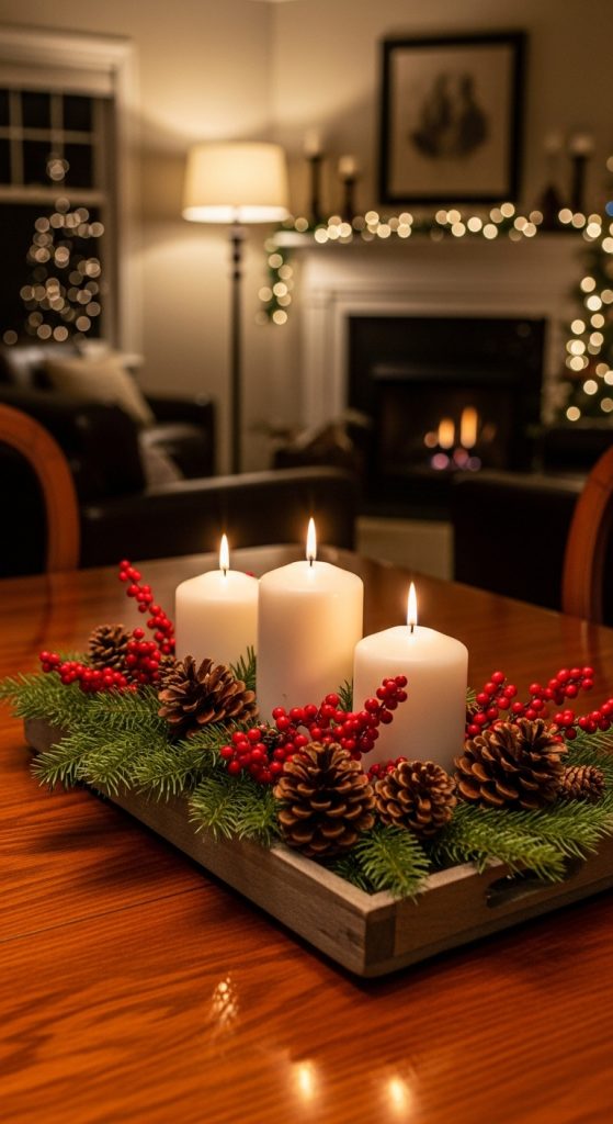 1. Classic Christmas Centerpiece with Pillar Candles