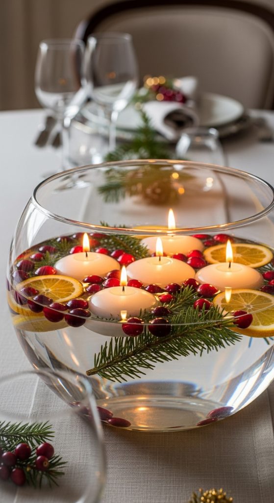 6. Floating Candle Bowls with Winter Accents