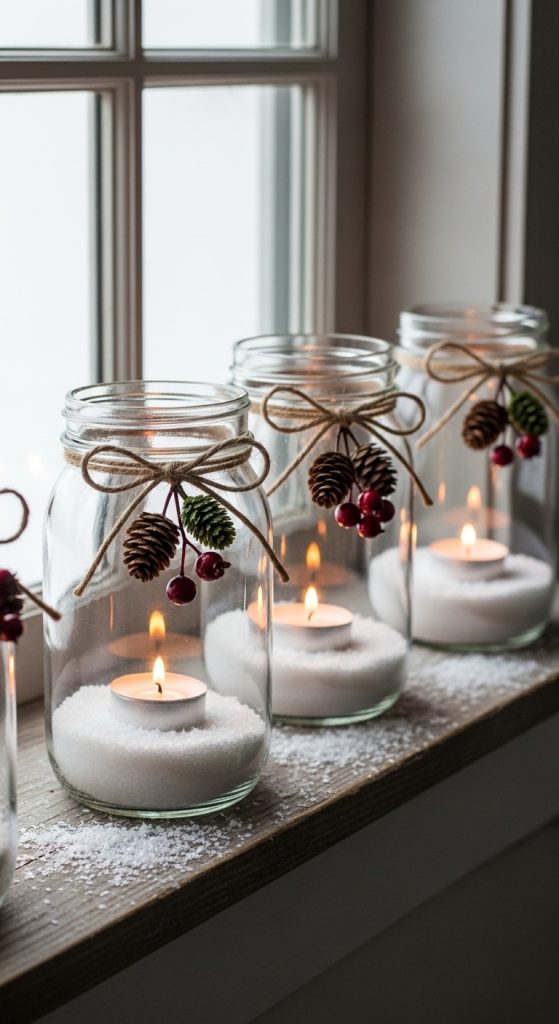 Mason jar candle lanterns are a charming and affordable option for Christmas decor, especially if you enjoy simple handcrafted designs. To prepare for this project, gather clear mason jars in medium or large sizes, tea light candles or small pillar candles, twine or jute, artificial snow, and small decorative elements such as mini pine cones or berry sprigs. Start by placing a small layer of artificial snow or coarse salt at the bottom of each jar to help elevate the candles and create a frosted winter look. Insert the candle securely, ensuring it stands upright. You can also add miniature seasonal accents inside the jar, but keep enough space for airflow. Wrap twine around the mouth of the jar and tie a simple bow to enhance the rustic appearance. These lanterns look beautiful when placed on windowsills, shelves, kitchen counters, or outdoor porch steps. Their soft glow reflects through the glass and creates a cozy, welcoming ambiance. This idea works especially well for rustic, farmhouse, or cottage style interiors. Safety is an important consideration, so avoid placing the lid on the jar while the candle burns to prevent heat buildup. Mason jar lanterns offer simplicity, charm, and versatility for your holiday decor.
