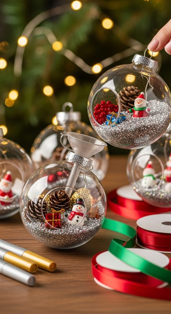 Materials Needed: Clear glass or acrylic ornaments, glitter, paint, small decorations, ribbons, markers, dried flowers or pinecones.