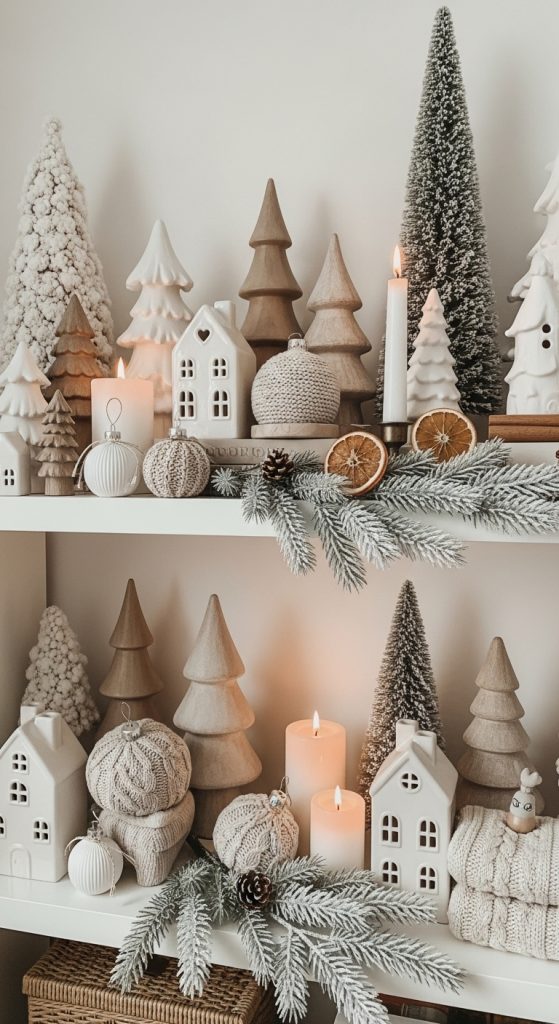 A neutral winter palette offers a warm and calming alternative to traditional Christmas colors. Start by gathering materials in tones like beige, cream, taupe, white, and light brown. You can use wooden trees, ceramic houses, knit textures, dried oranges, neutral candles, and soft greenery such as frosted eucalyptus or pine. For added warmth, incorporate natural elements like cinnamon sticks, wooden beads, and wicker baskets. Arrange items in layers by placing larger dรฉcor at the back, such as tall ceramic trees or framed winter prints, and smaller accents at the front. Creating groups of three items helps maintain visual harmony. Neutral styling shines when textures are varied, so mix smooth ceramics with woven pieces and soft knits to create dimension. Avoid excessive symmetry to keep the look casual and lived in. This style is perfect for Scandinavian inspired homes or minimal spaces because it adds holiday beauty without overwhelming the room. By keeping the colors subtle but the textures rich, you create a winter shelf display that feels peaceful, cozy, and timeless.