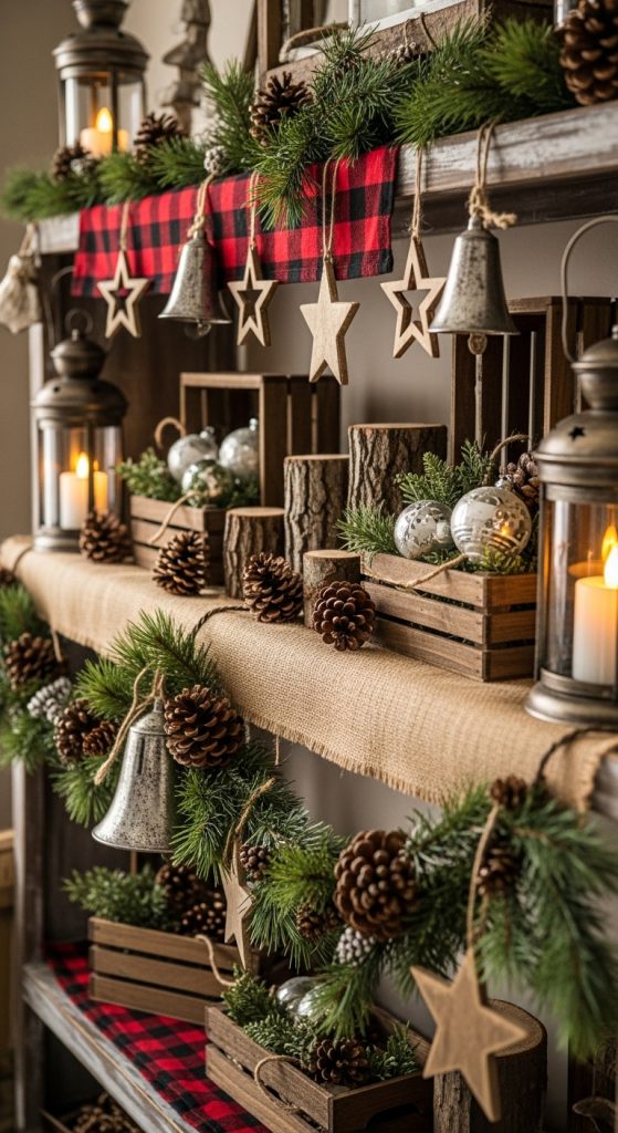 Rustic farmhouse dรฉcor lends itself beautifully to Christmas styling because of its warm and homey aesthetic. Begin with a materials list that includes distressed wood pieces, galvanized metal, burlap, plaid fabric, small wooden crates, rustic signs, and simple pine garlands. Add touches of nature like pine cones, dried berries, and small logs tied with twine. When arranging your shelf, start with larger pieces such as a distressed wood sign or wooden lantern as your anchors. Then add medium sized items like vintage jars filled with ornaments or mini Christmas trees wrapped in burlap. Finish by filling gaps with smaller details such as berries, bells, or farmhouse style labels. The key to farmhouse styling is a balance between raw textures and warm tones. Try to incorporate at least one plaid pattern to reinforce the farmhouse theme, whether through ribbon, fabric wrapped ornaments, or a small folded blanket. This look works well in kitchens, living rooms, and entryways. With its mix of nostalgic textures and simple materials, a rustic farmhouse display adds charming character and comfort to your holiday dรฉcor.