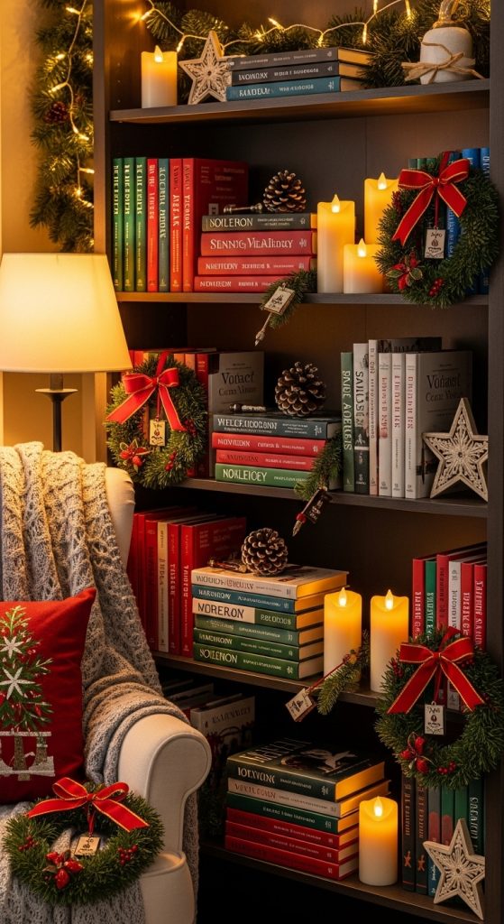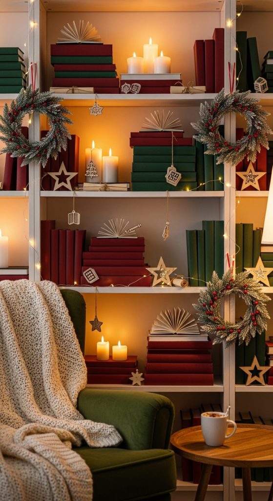 7. Bookshelf Christmas Styling for Readers
