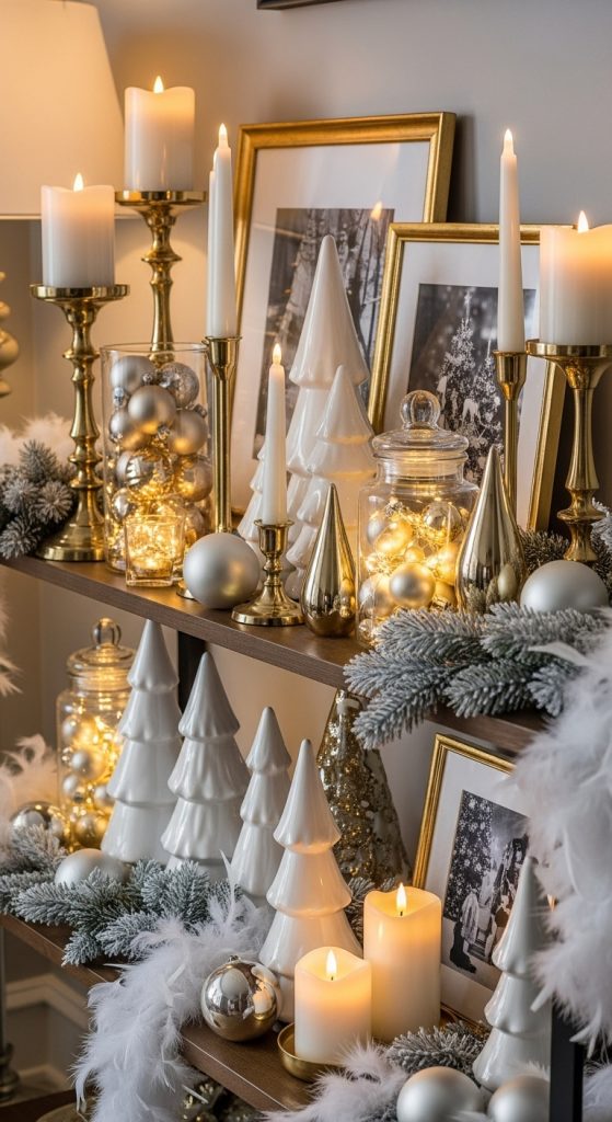 Gold and white create a sophisticated and luxurious holiday look. Start with materials such as gold candle holders, white ceramic trees, pearl toned ornaments, gold picture frames, glass jars, and soft white garlands. Add metallic accents through ribbons or brushed gold trinkets. Begin styling by placing large white pieces like ceramic houses or vases at the back of the shelf to build a light foundation. Add gold items in front to create depth and contrast. Use glass elements to keep the look airy and refined. Integrate ornaments in bowls or trays to add shine without cluttering. A combination of matte and metallic finishes will create a balanced elegance. Consider adding warm white fairy lights for a gentle glow. This style works well in modern, classic, or luxurious interiors. A gold and white shelf exudes grace and creates a festive atmosphere without bold colors. The result is a timeless Christmas display that feels upscale and harmonious.