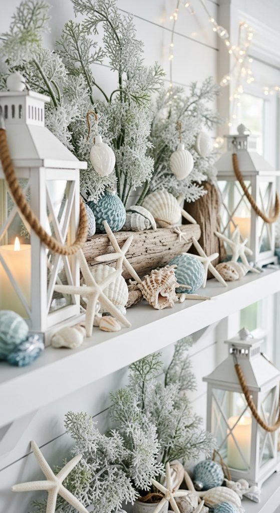 A coastal Christmas shelf brings a light and breezy holiday feel, perfect for homes near the sea or for anyone who loves soft beach inspired dรฉcor. Start with materials in shades of blue, white, sandy beige, and soft green. Include seashell ornaments, driftwood pieces, starfish, white lanterns, rope accents, and frosted greenery. Begin styling with driftwood or a rope garland as your base. Add seaside elements like starfish or coral shaped dรฉcor. Mix them with classic Christmas pieces such as mini trees or small white houses to keep the look festive. Use blue glass jars filled with white ornaments to tie the coastal palette to the holiday theme. Keep the arrangement airy by leaving plenty of open space between items. Coastal Christmas styling is ideal for bright rooms with natural light or homes featuring airy interiors. It creates a calm and refreshing seasonal atmosphere that feels different from traditional holiday dรฉcor. With soft colors and natural textures, a coastal inspired shelf adds a serene charm to Christmas decorating.