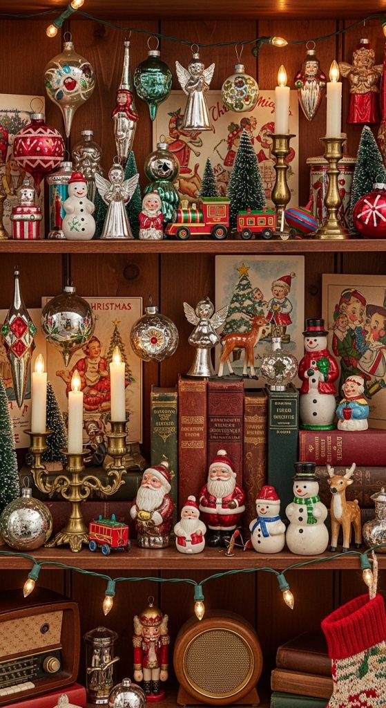 Vintage Christmas styling creates a nostalgic and charming mood that reminds many people of childhood holidays. Begin by collecting materials such as antique ornaments, old fashioned figurines, classic books, tin toys, brass candle holders, and retro Christmas cards. Incorporating items from thrift stores or family keepsakes will add authenticity. To build the shelf display, start with vintage books stacked horizontally or vertically to create height. Add small figurines like ceramic angels or old village houses. Display ornaments in glass bowls or trays to highlight their age and detail. Vintage colors such as muted greens, soft reds, and golds will help unite the look. Consider adding a strand of classic tinsel or beaded garland for a traditional feel. Use warm lighting like battery operated candles to enhance the nostalgic mood. The charm of vintage dรฉcor comes from the mix of materials and the story behind each item. This style suits eclectic homes, traditional interiors, or anyone who loves sentimental Christmas themes. A vintage inspired shelf invites warmth, history, and character into your holiday decorating.