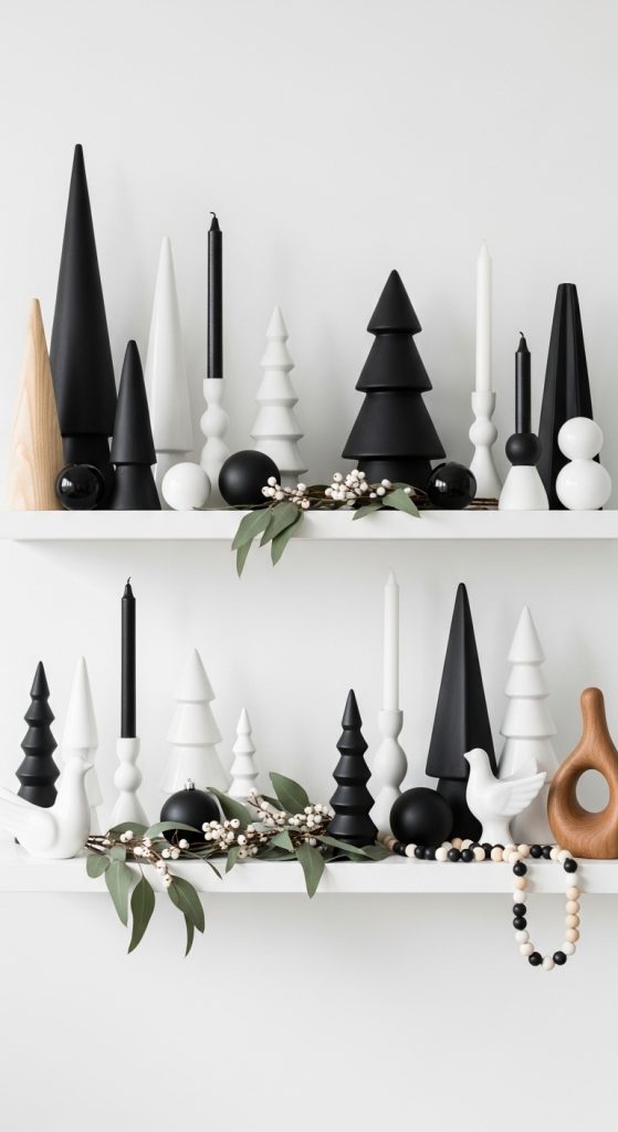 A minimal modern Christmas shelf prioritizes clean lines, simple shapes, and high contrast elements. Begin by gathering materials in black, white, and natural wood tones. You can include geometric trees, matte ornaments, modern candle holders, simple garlands, black framed prints, and small sculptural pieces. Keep your selection intentional and avoid overcrowding to maintain a minimal look. Start with a strong focal point such as a monochrome print or a set of tall candle holders. Add one or two small evergreen sprigs to introduce softness without clutter. Use repetition to create a cohesive modern look. For example, three black ornaments or two identical wooden trees can serve as a subtle design theme. Leave plenty of empty space between items to allow the design to breathe. The goal is not to fill the shelf but to highlight each piece through simplicity. This style works perfectly in contemporary, Scandinavian, or industrial homes. It adds a sleek and sophisticated type of holiday dรฉcor that feels festive without overwhelming the room. A minimal modern shelf is ideal for those who prefer clean aesthetics with subtle seasonal touches.