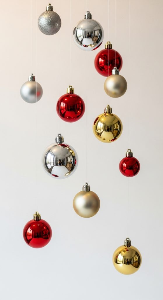 Transform your wall into a floating display of Christmas ornaments. Use clear fishing line or thin ribbon to hang ornaments at different heights from a curtain rod or mounted hooks.