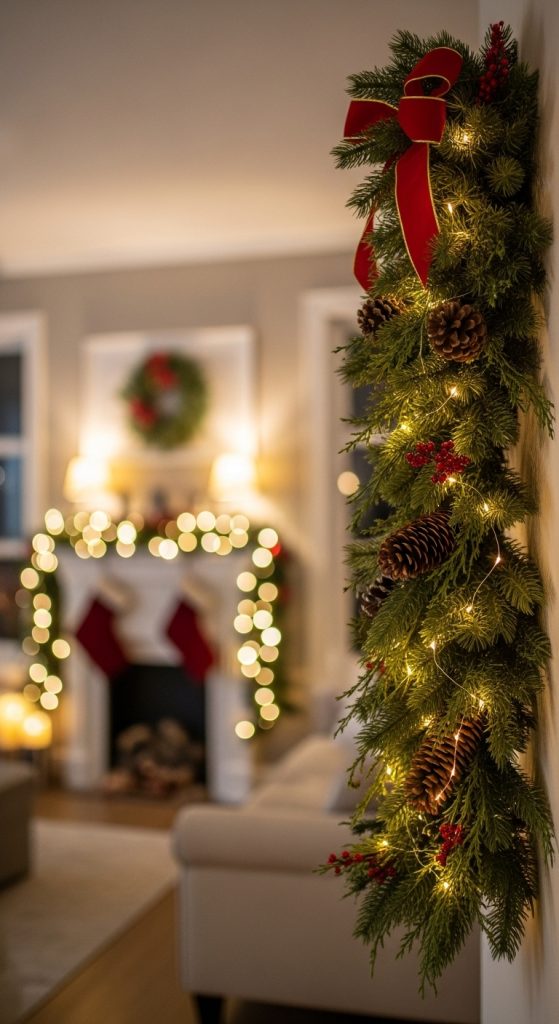 Garlands are a timeless holiday staple that can instantly add warmth and charm to any room. Drape lush evergreen garlands along walls, mirrors, or door frames for a classic Christmas feel. You can also weave in twinkling fairy lights, pinecones, berries, or red bows for extra detail.