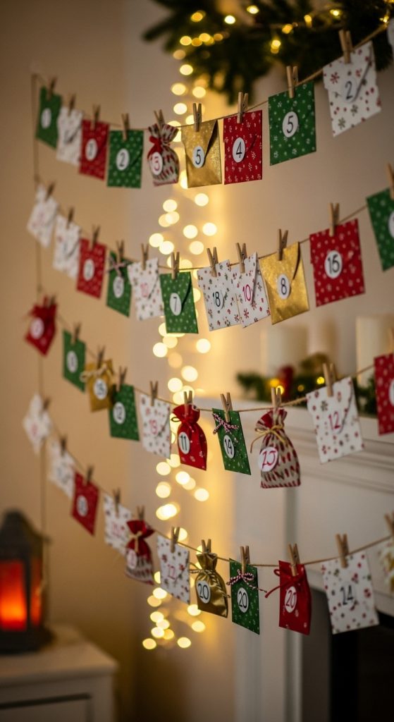 Turn your wall into a countdown celebration by creating a DIY Advent calendar. Use envelopes, small gift bags, or tiny boxes numbered 1 to 25, and hang them in rows using string and mini clothespins.