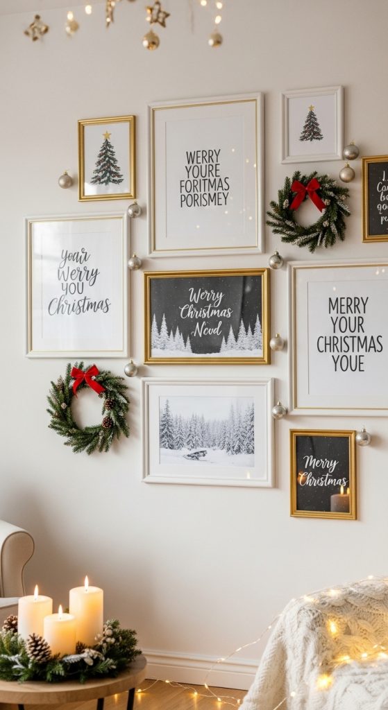 Create a festive gallery wall that reflects your Christmas spirit. Replace your everyday artwork with seasonal prints featuring winter landscapes, holiday quotes, or illustrations of reindeer and snowflakes.