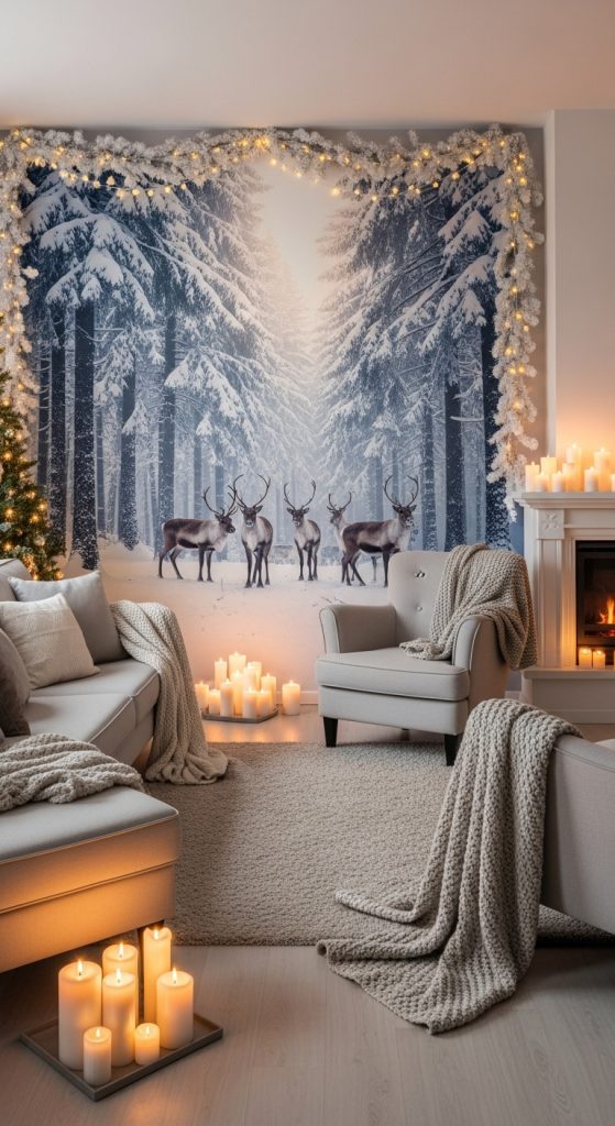 Peel-and-stick murals are easy to install and remove, making them perfect for temporary seasonal decor. You can complement the mural with twinkling lights, candles, or white garlands to enhance the theme.