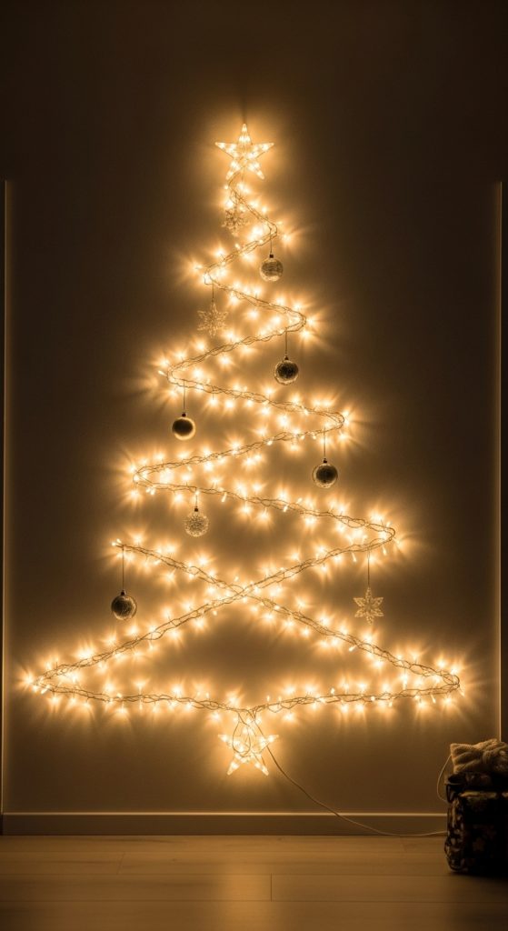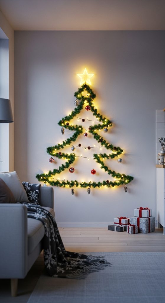 If you’re short on floor space, a wall-mounted Christmas tree is the perfect solution. Create the shape of a Christmas tree directly on the wall using garlands, lights, or washi tape.