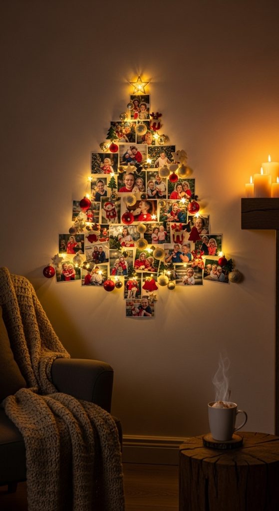 Celebrate memories by creating a Christmas-themed photo wall. Use printed photos from past holidays or family portraits, arranged in the shape of a Christmas tree or wreath.