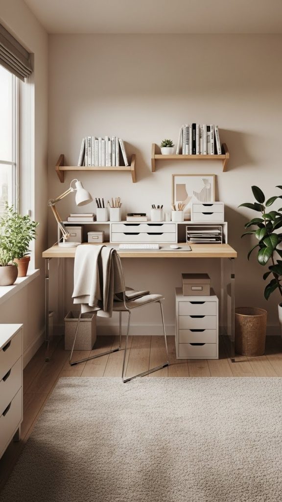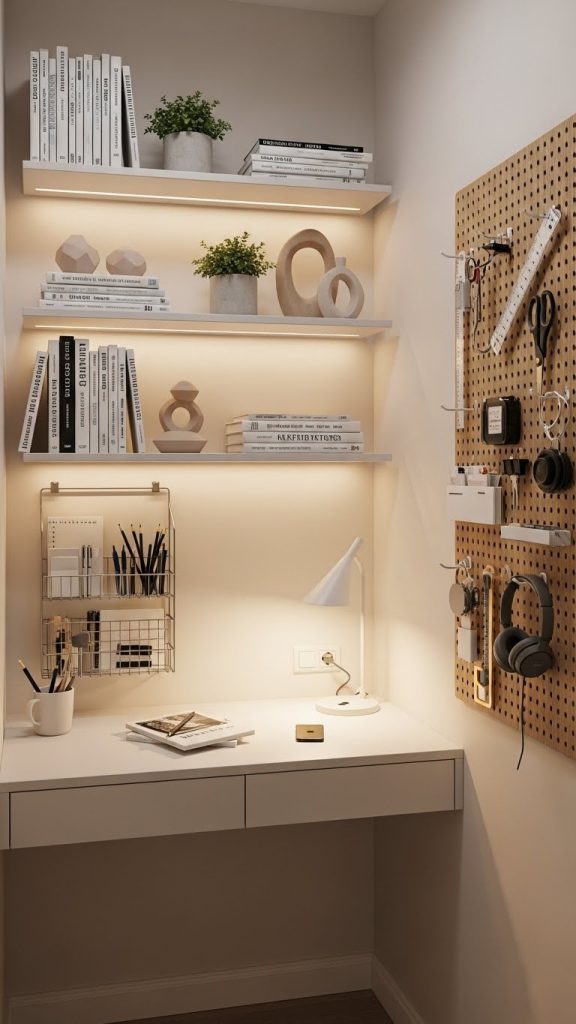 Materials needed may include wooden shelves, metal brackets, screws, a drill, pegboard panels, or hanging organizers made from fabric or wicker. When installing shelves, make sure they are properly anchored to support weight safely. Arrange your storage units in a visually pleasing way by mixing functional items with decorative pieces like framed photos, small plants, or candles. This helps blend practicality with aesthetics. Keeping everyday essentials within reach while placing less used items higher up ensures smooth workflow. Vertical storage not only enhances organization but also contributes to a cleaner, cozier workspace by reducing clutter on your desk and floor.