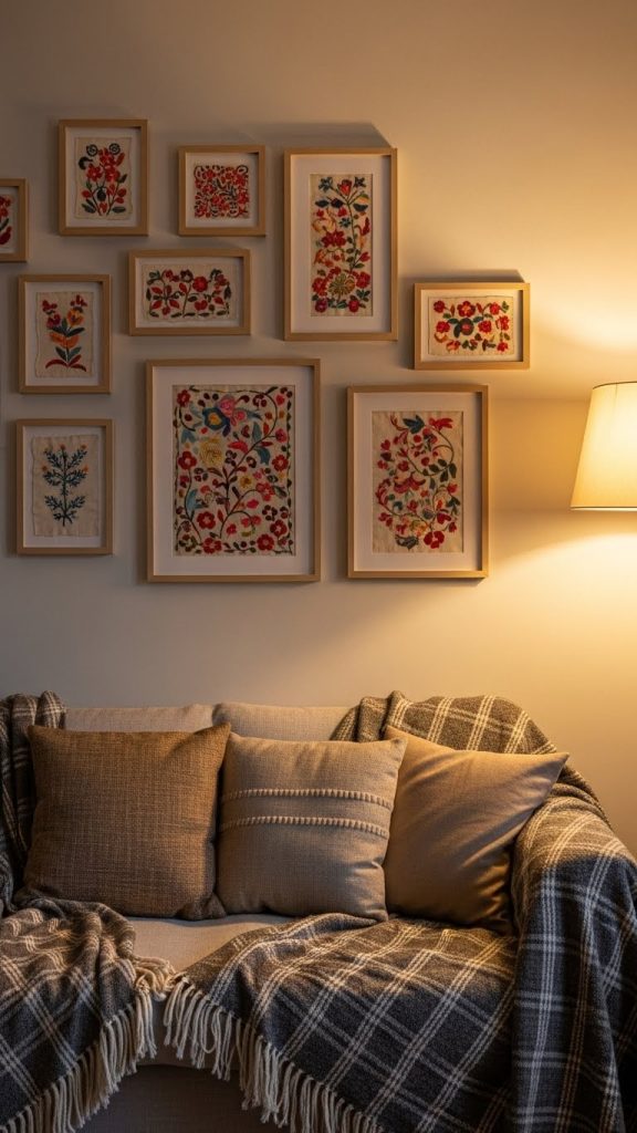 Using fabric as wall art is an affordable and creative way to add color and texture. You can frame pieces of embroidered fabric, quilts, or patterned textiles.