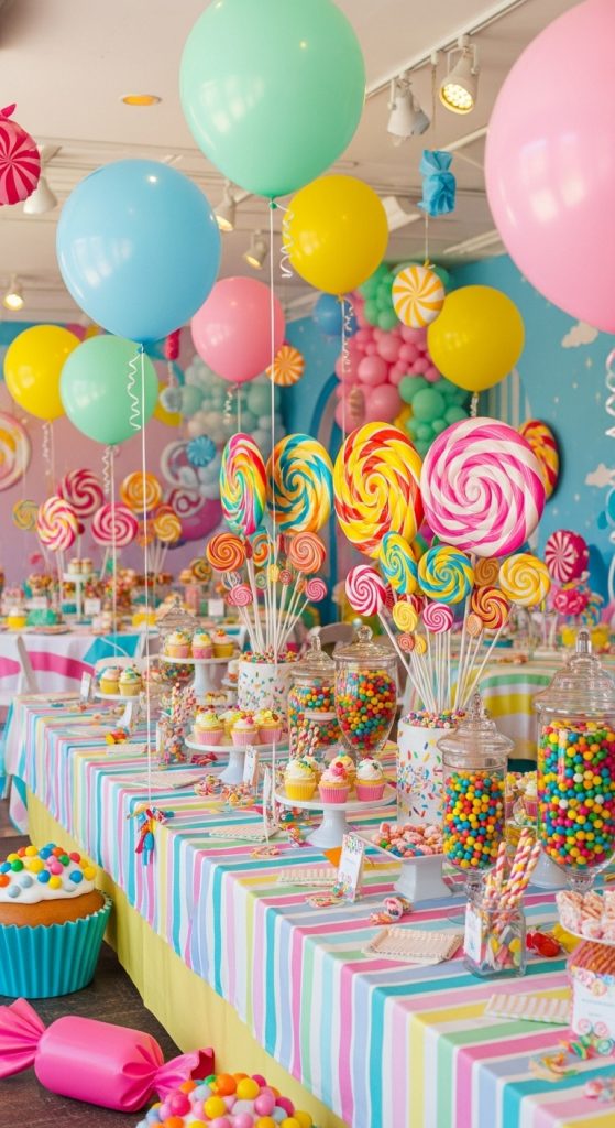 Decorate with oversized candy props, pastel balloons, and striped table runners. Prepare candy jars, lollipops, cupcakes, and chocolate fountains.