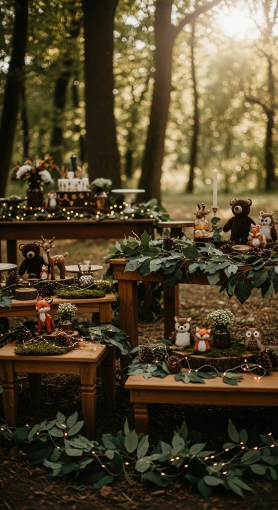 A woodland theme brings warmth and creativity together, perfect for cozy indoor celebrations or outdoor settings.