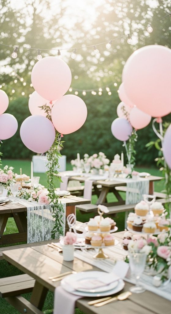 Use pastel-colored tablecloths, floral centerpieces, and light string fairy lights. Include delicate paper lanterns and soft bunting banners. For table settings, use pastel plates, gold-rimmed glasses, and floral napkins.