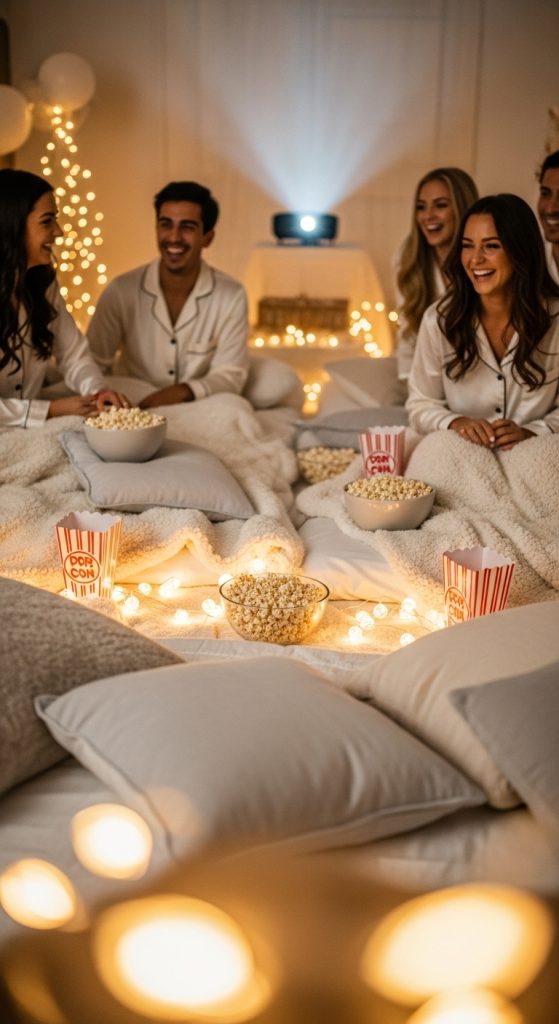 Set up cozy floor seating with soft blankets, fluffy pillows, fairy lights, and small snack trays. Prepare goodie bags with sleep masks, popcorn, and small treats.