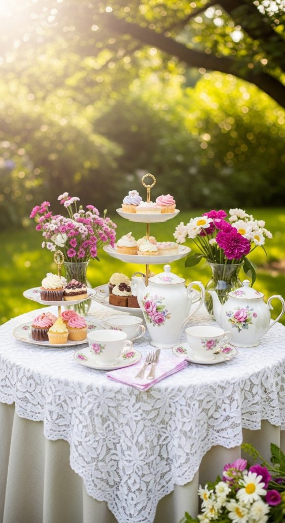 Gather teacups, saucers, tiered dessert trays, floral tablecloths, lace runners, and fresh flowers. Use pastel china and golden cutlery for a sophisticated touch.