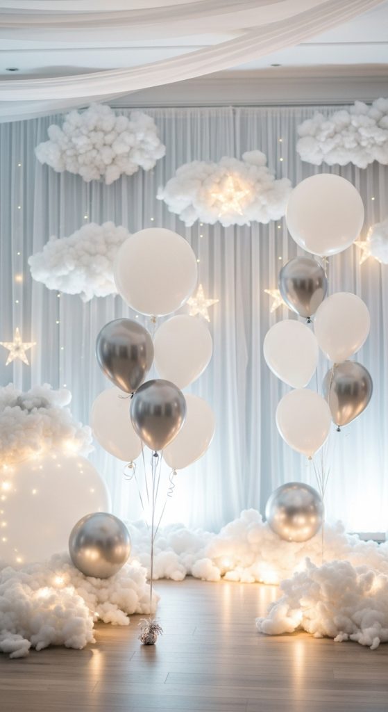 Use white and silver balloons, fluffy cotton clouds, star-shaped garlands, and soft lighting. Add silver tableware and moon-themed accents.