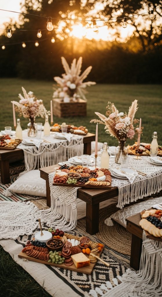 Arrange low tables with floor cushions and picnic baskets filled with snacks. Serve fruit platters, charcuterie boards, and lemonade in glass bottles. Add string lights or candles for a warm evening glow.