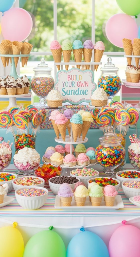 Prepare an ice cream bar with bowls, cones, sprinkles, chocolate sauce, whipped cream, fruit toppings, and candy. Decorate the space with pastel balloons, striped tablecloths, and paper ice cream cutouts.