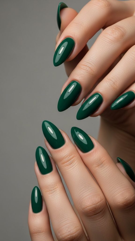 Dark emerald green nails bring a regal touch to any look. Start with standard preparation, including trimming, shaping, and buffing. Use a cleansing wipe to eliminate oils from the nail plate. Select a jewel toned emerald polish, preferably one with a smooth formula to avoid streaking. Apply a solid base coat to prevent staining. Add two coats of emerald polish, ensuring they dry properly between layers. For added depth, you may choose a gel formula which offers richer pigmentation and longer wear. Seal with a glossy top coat for a gemstone like shine. The dark green shade works well for winter and autumn but also stands out during evening events. It pairs well with gold accessories and dark clothing. The result is a luxurious nail look that provides both boldness and elegance without overpowering the overall style.